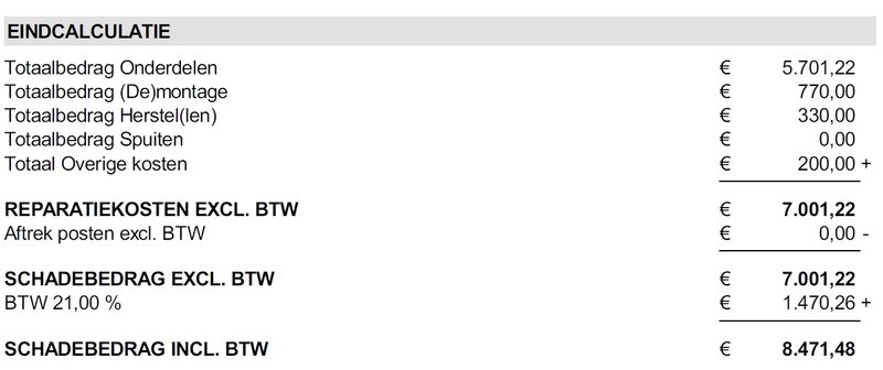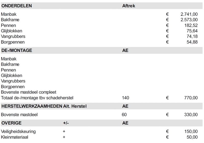 De Oil & Steel hoogwerker kon nog wel hersteld worden, de reparatiekosten kwamen op € 7.001,22 excl. btw conform onderstaande specificatie.